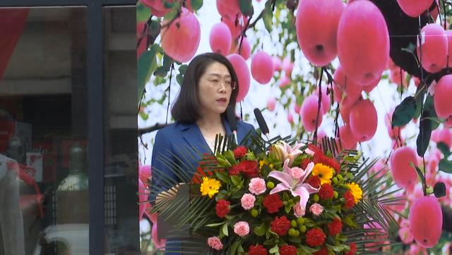 郭丽君在致辞中说,近年来,合水县坚持把培育增收致富产业作为重要抓手,按照“稳面积、调结构、强管理、树品牌”的工作思路,不断引进新品种,抓实苹果新栽和郁闭园改造,强化品牌宣传和市场营销,不断推动苹果产业转型升级、健康发展。“合水苹果”通过国家地理标志登记及证明商标注册,多个苹果产品先后获得了“中华名果”、“国家优质苹果金奖”、“ 甘肃省十大名果”等殊荣,合水县也获得了“中国优质苹果之乡”的称号。目前,苹果产业已覆盖合水县的11个乡镇、69个行政村,其中苹果专业乡镇3个、专业村26个,果园留存面积达到10万亩,建成省部级苹果标准化示范园13处7500亩,市级示范园5处2720亩,全县建办果品专业合作社25个,建成果品贮藏库19座,年储藏能力达8.45万吨。