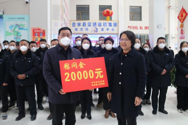 春节将至,1月16日,合水县委书记邓莉娟,县委副书记、县长陈会发,县政协主席何维莉等四大家县级领导深入县公安局、县消防救援大队、合水一中、县城管局、县人武部、县武警中队、西合一级公路一标段项目部、县交通运输集团有限公司、采油十二厂等地,走访慰问人民警察、武警官兵及一线工作人员,向他们送上新春的祝福及慰问金,感谢他们为全县社会事业建设作出的积极贡献,并向他们致以节日的问候和祝福。