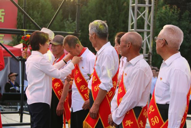 干部职工合唱比赛前,邓莉娟为12名“光荣在党50年”老党员代表颁发纪念章。