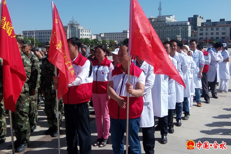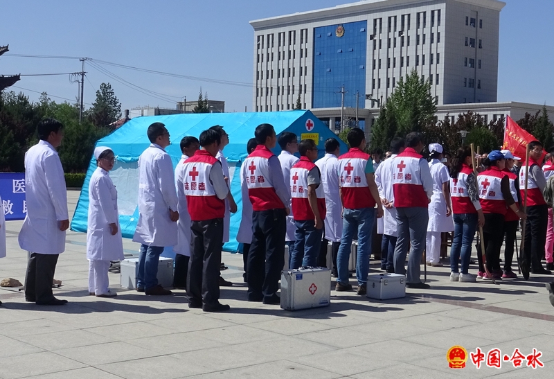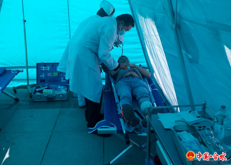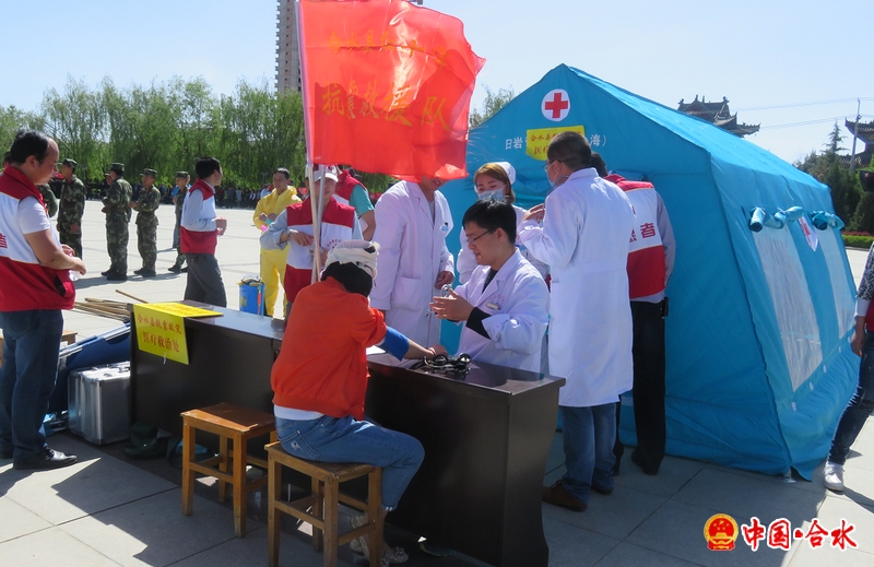 5月10日14:50分,随着一阵急促的地震警报声响起,全市抗震救灾综合应急演练在合水县乐蟠广场正式开始,县卫计局接到抗震救灾指挥部通知,我县卫生6.5级地震,烈度8度,造成多处房屋倒塌,部分干部群众受伤被困,急需救援。县卫计局立即启动《抗震救灾医疗卫生应急预案》,抽调卫生应急救援队员20人、红十字志愿者10人、救护车2辆,并携带担架、急救包、撬杠、铁锹等救援装备,迅速赶到预定地点集结。当第二声防空警报响起,卫生救援队、红十字志愿者救援队携带所有应急装备迅速赶往应急集结区,并在10分钟内率先完成了医疗救治帐篷、义诊台等诊疗设施的搭建任务。各救援小组在接到指挥部下达的救援任务后,立即赶往各救援点,迅速抢救出受伤群众,由医疗组或红十字志愿者进行了初步救治,并立即转运至指挥部医疗救治处进行系统治疗。疾控防疫人员适时对灾民安置区、学校等公共场所进行消毒,并开展疫情防控监测,预防传染病等次生灾害发生。