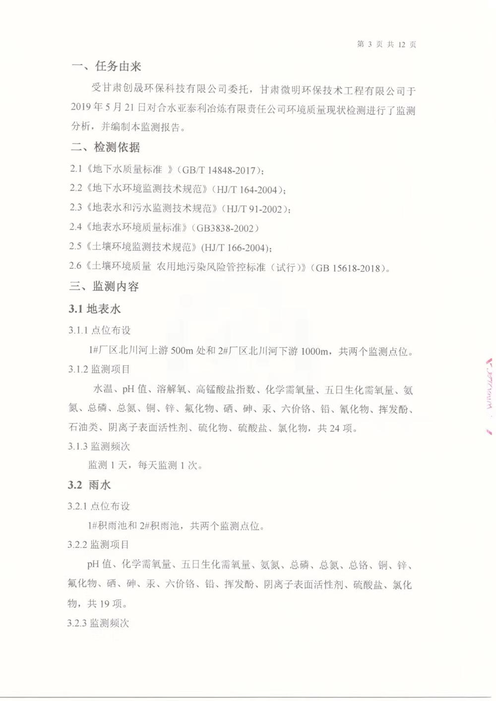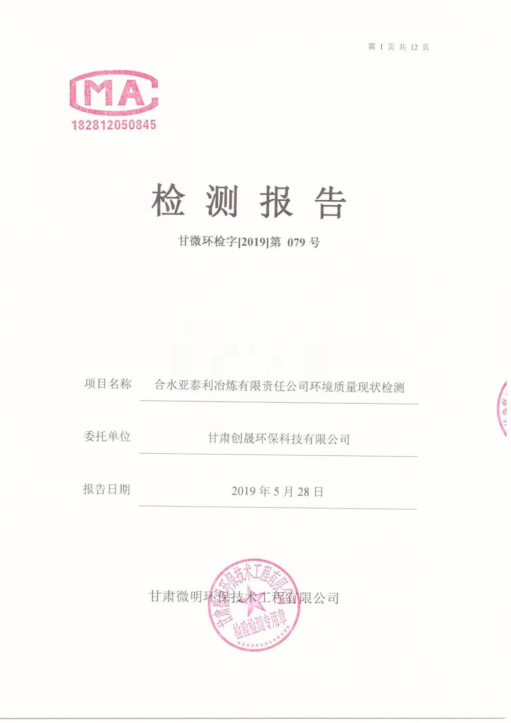 合水亚泰利冶炼有限责任公司环境质量现状检测报告公示 来源: 作者: 发布时间:2019-10-15 11:32:37 浏览次数: 次 【字体:小 大】 终审:李娟娟 【打印文章】 【关闭窗口】 分享到: